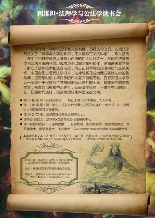 基于以上种种考量,并配合学校“思想交大”建设和学院法理学和公法学的学科建设,平博在线,平博在线(中国)“立法与社会治理研究中心”发起创办“利维坦·法理学与公法学读书会”系列活动。本学期该活动选取的经典文本为让·博丹的《主权论》,并于10月18日晚7时在学院会议室举行了首场活动,平博在线,平博在线(中国)丁卫副教授、吉兰湘老师、彭何利博士、苏青博士、王朝恩博士、卞苏博士、唐学亮博士等10余位师生参加。主权理论是现代民族-国家兴起的理论前提,而民族-国家又是现代社会最重要的一个政治与法律现象,并与中国近代以来持续至今的伟大而艰难的国家转型勾连起来,因此,不得不察。在该场读书会活动中,主讲教师唐学亮针对博丹《主权论》一书的“导论”部分,就“为什么读博丹?”、“怎么读博丹?”、“博丹的思想里程与理论建构”以及“博丹理论的缺陷”等四个方面做了一个提纲挈领而又不失理论深度的学术报告。之后,就报告的内容及书中所启示的一些重大理论与现实问题,与会人员各自发表了自己的看法,并展开了热烈的讨论。首场读书会活动取得了预期的效果,我们将在两周后的同一时间举行第二场活动。“路漫漫其修远兮,吾将上下而求索”!