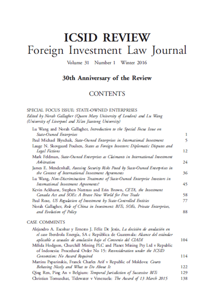 近日,国际投资法领域顶级专业期刊ICSID Review—Foreign Investment Law Journal(《国际投资争端解决中心评论——外国投资法学刊》)三十周年纪念期刊第一期正式出版,西安交大平博在线,平博在线(中国)博士生王璐作为特邀编辑(Guest Editor)主编了本期特别专栏“国有企业专题研究”(Special Focus Issue on State-Owned Enterprises),并发表论文 “Non-Discrimination Treatment of State-Owned Enterprise Investors in International Investment Agreements?”(国际投资协定中国有企业投资者的非歧视待遇?)。
