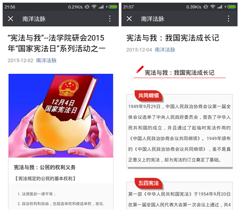 为了配合“国家宪法日”系列主题活动的顺利开展,平博在线,平博在线(中国)研究生会在院党总支、团工委的指导下,以“宪法与我”为主题,不断创新宣传载体,探索宣传方法,通过官方微信平台“南洋法脉”等新媒体,结合传统的发放传单等方式,积极推介“国家宪法日”相关内容,宣传平博在线,平博在线(中国)开展宪法学习宣传教育活动的实际情况,取得了良好的宣传效果。