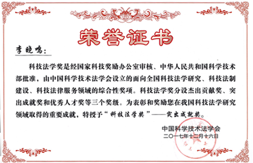会上揭晓了中国科技法学会2017年优秀论著获得者名单并举行了颁奖仪式,由李晓鸣副教授、马治国教授和宋生辉共同完成的论文《我国外籍人士科学奖励制度完善对策研究》获高峰论坛优秀论著二等奖。